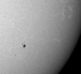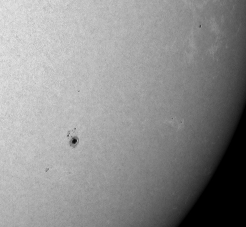 Auch die Sonne ist ein sehr interessantes Objekt für den Amateurbeobachter, denn die äusseren Schichten dieses heissen Gasballs sind ständiger Veränderung unterworfen. Während Beobachtungen mit speziellen engbandigen Filtern zusätzliche Phänomene sichtbar machen können, ermöglicht selbst ein kleines Teleskop zur Beobachtung im Weisslicht immerhin die Darstellung der kühleren Sonnenflecke (dunkle Gebiete) sowie der etwas heisseren Fackelgebiete (helles Netzwerk). Auf der am Aufnahme unseres Vereinsmitgliedes Frank Hase sind ausserdem die Randverdunkelung der Sonnenscheibe (schräg austretendes Licht entspringt aus etwas höheren, kühleren Schichten) und die Sonnengranulation erkennbar (Granulation: etwas heissere aufsteigende Gasblasen sind von kühlerem, absinkendem Gas umgeben - diese Brodeln erzeugt den krisseligen Hintergrund -besonders auffällig im zentralen Bereich der Scheibe). Es wurde ein Linsenfernrohr chinesischer Fertigung mit 100 mm Öffnung und 900 mm Brennweite verwendet. Vor dessen Eintrittsöffnung diente eine Baader Filterfolie zur Abschwächung des Sonnenlichtes. Eine Negativlinse verlängerte die Brennweite auf etwa 2 Meter und als Sensor kam eine Sony NEX-3 Kamera zum Einsatz. Das gezeigte Bild ist eine Überlagerung von 10 Einzelaufnahmen.