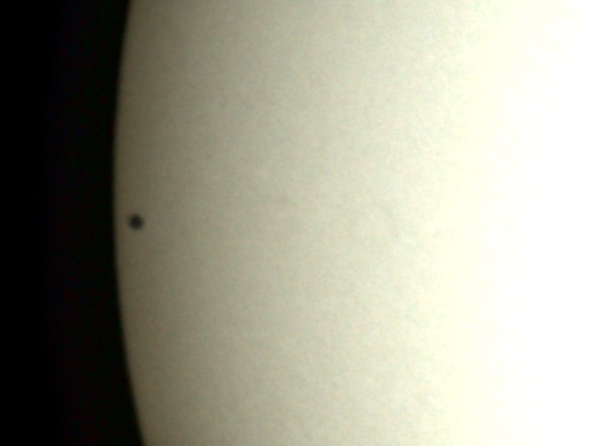 Nach den letzten drei wirklich nahezu unfassbar schönen Tagen die so mancher Astrofan durchgängig schlaflos verbracht hat, wie ich auch (einen fetten Kuss an meine Frau die so einiges mit mir erlebt hat…!) habe ich auf schönes Wetter auch für den Merkurtransit gehofft. Die Aussichten haben Wettereinschränkungen vorhergesagt. Trotzdem, das Equipment war pünktlich aufgebaut. Die Sonne war doch sehr bemüht milchig und diesig durch die Suppe durchzukommen. Immerhin war der Eintritt 13.12 Uhr deutlich wahrnehmbar und dann ging es auch mit dem Wetter bergauf. Bis 15.20 Uhr war alles o.k. Merkur ein sehr schönes, randscharfes Scheibchen, dazu einige Fleckchen auf der Sonne. Mit Baader visueller Sonnenfolie war bei ISO 400 eine Belichtungszeit bei f8 von 1/630 möglich. Beim Eintritt war es noch 1/400. Für einige Bilder habe ich auch die Serienbildfunktion meiner Sony a7II genutzt mit der Einstellung auf high. Merkur bewegt sich doch recht schnell und wenn ich Bilder stacken will sollte er nicht weiterwandern, sonst gibt’s ein Osterein auf der Sonnenscheibe.
