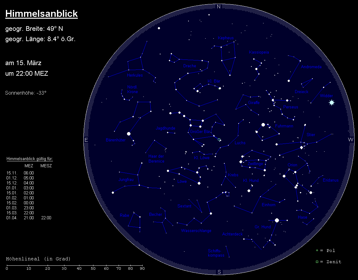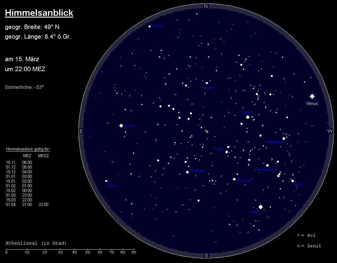 Das Wintersechseck, zusammengesetzt aus den Sternen Capella, Pollux, Procyon, Sirius, Rigel und Aldebaran, ist nun vollständig nach Südwesten gerückt. Das Sternbild Orion hat sich schon deutlich dem Horizont genähert. Ebenso der Stier und das Sternbild Großer Hund mit dem hellsten Stern des Himmels, Sirius. Die Sternbilder Hase und Achterdeck befinden sich bereits im Untergang. Hingegen das Sternbild Fuhrmann mit der hellen Capella, das Sternbild Zwillinge mit den hellen Sternen Castor und Pollux sowie der Kleine Hund mit Procyon noch in größerer Höhe zu finden. Zwischen Kleinem und Großem Hund ist das schwache Sternbild Einhorn positioniert.