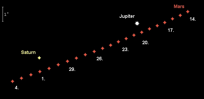wird zu einem auffälligen Objekt des Morgenhimmels. Der rote Planet steigert seine Helligkeit von 1.1m auf 0.8m. Sein Aufgang erfolgt zu Monatsbeginn um 4:30 MEZ, am Monatsende um 4:45 MESZ. Der durch das Sternbild Schütze laufende Planet überholt am 20. März Jupiter in 0.7° südlichem Abstand und am 31. März Saturn in 0.9° südlichem Abstand. Trotz der frühen Morgenstunde sollte man sich diese Konjunktionen nicht entgehen lassen. Bereits am 18. März steht der Mond nahe des Planetenduos Mars/Jupiter; dabei findet man den Erdtrabanten 3° rechts unterhalb des roten Planeten. Im Teleskop kann auf dem nur 6“ großen Scheibchen kaum etwas ausgemacht werden.