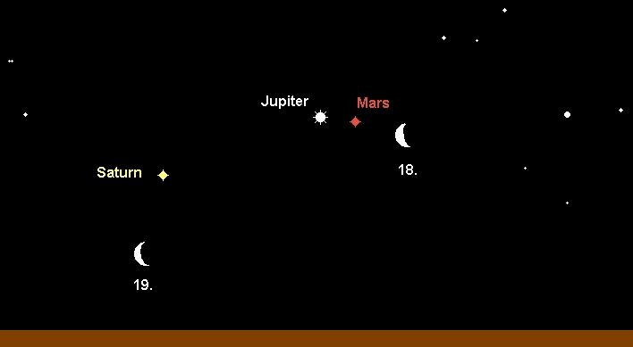 ist ein gut erkennbares bis auffälliges Objekt am Morgenhimmel. Der langsam durch das Sternbild Schütze laufende –2.0m helle Riesenplanet verlagert seine Aufgänge während des Monats von 5:00 MEZ auf 4:30 MESZ. Am 20. März passiert Mars den größten Planeten in 0.7° südlichem Abstand. Die schmale Mondsichel findet man bereits am 18. März rechts oberhalb von Jupiter. Im Teleskop präsentiert sich das Planetenscheibchen mit einem Äquatordurchmesser von 36“.
