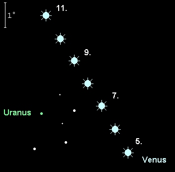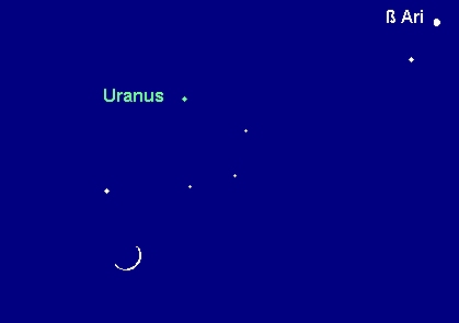 verschwindet Ende des Monats vom Abendhimmel. In der zweiten Monatshälfte dürften ihn nur noch Spezialisten in geringer Höhe über dem WNW-Horizont ausmachen können. Der 5.9m helle Planet bewegt sich durch das Sternbild Widder und verlagert seine Untergangszeiten von 22:45 MEZ auf 21:45 MESZ. Venus passiert den Planeten am 9. März 2.2° südlich. Am 26. März steht die schmale Mondsichel 5° rechts oberhalb des grünlichen Planeten und kann bei der eventuell letzten Sichtung behilflich sein.