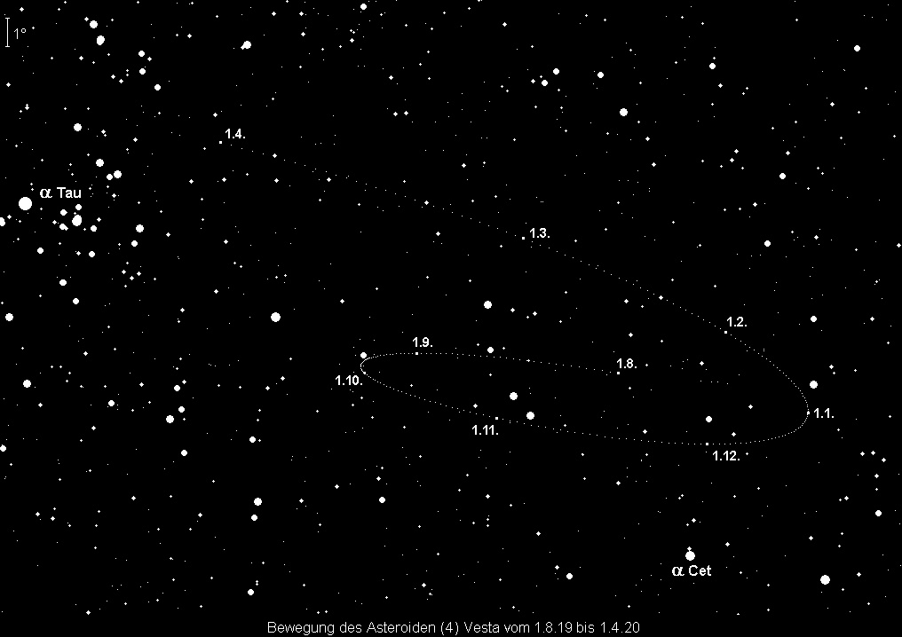 steuert auf das Goldene Tor der Ekliptik zu, d.h. auf die Lücke zwischen den Hyaden und den Plejaden. Kleinplanet Nr. 4 wird langsam schwächer und erreicht zum Monatsende eine Helligkeit von 8.4m, so dass er kein einfaches Objekt mehr ist. Die Untergänge erfolgen zu Monatsbeginn um 0:30 MEZ, am Monatsletzten um 0:30 MESZ.