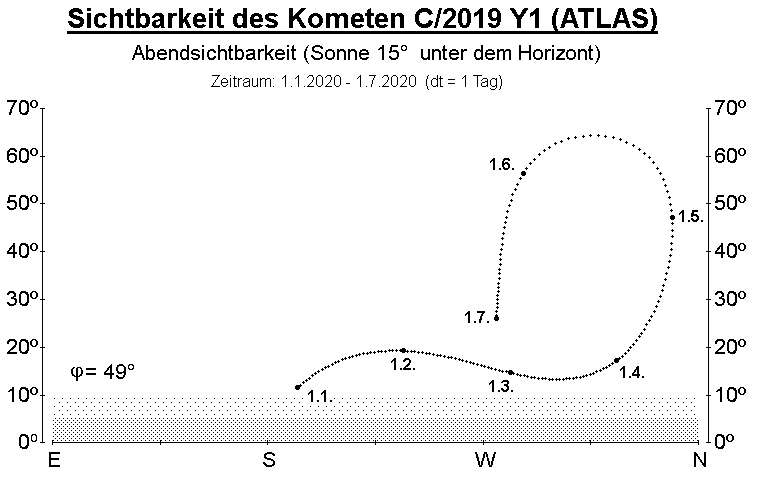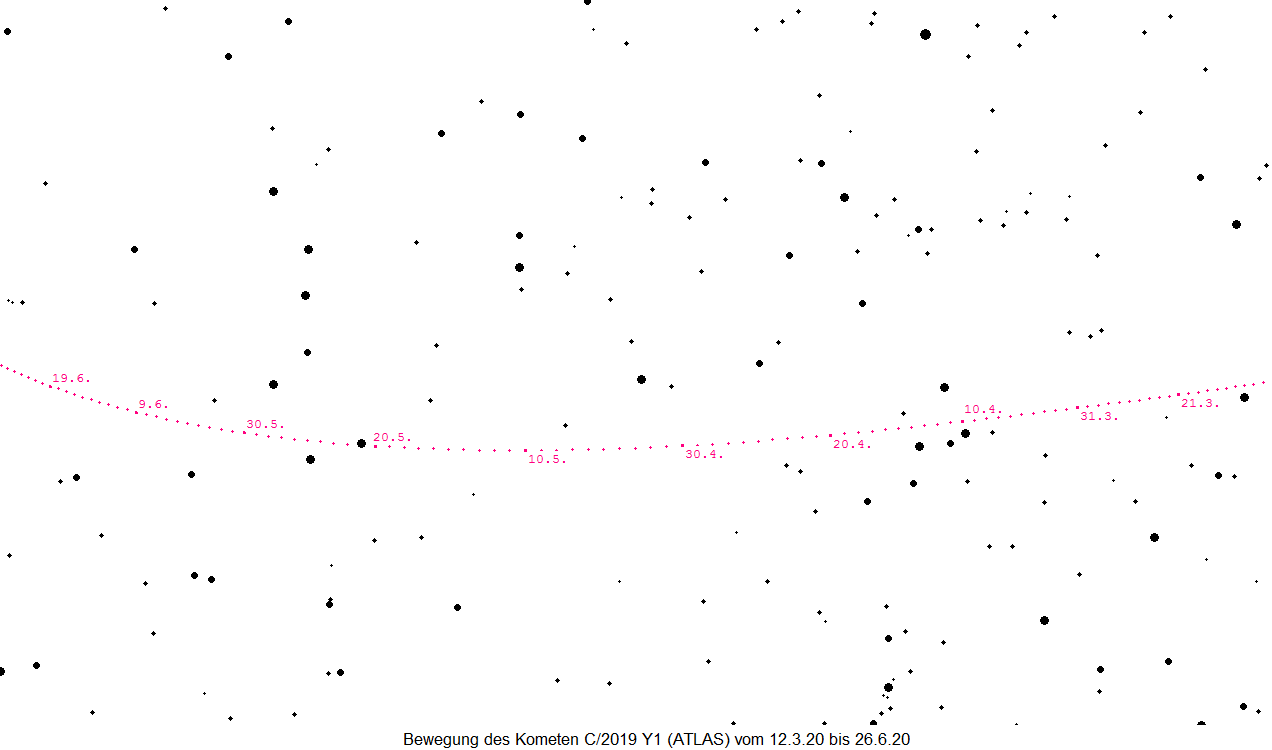 Der Mitte Dezember 2019 entdeckte Komet C/2019 Y1 (ATLAS) zeigte bislang eine ungewöhnliche Helligkeitsentwicklung. Nachdem er zunächst wesentlich rascher heller wurde als erwartet, blieb seine Helligkeit bis Mitte April überraschenderweise konstant. Aktuell 8.0m hell, zeigt er eine recht kompakte Koma. Wie er sich weiterentwickelt, kann in den nächsten Wochen bequem am nördlichen Abendhimmel verfolgt werden (Details siehe Quick_101.pdf).