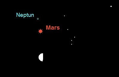 wird zu einem auffälligen Objekt der zweiten Nachthälfte. Er steigert seine Helligkeit in diesem Monat von 0.0m auf –0.5m, womit ihn nur Venus und Jupiter übertreffen. Seine Aufgänge verlagert er von 2:30 MESZ auf 1:15 MESZ. Am Morgen des 13. Juni wandert Mars nur 1.8° nördlich an Neptun vorbei – eine im Fernglas schwierig zu beobachtende Konjunktion. Am gleichen Morgen findet man den Mond 3.5° unterhalb von Mars. Am 24. Juni wechselt der Rote Planet vom Sternbild Wassermann in das Sternbild Fische. Im Teleskop zeigt sich der Planet mit einer deutlichen Phase – nur 85% des zur Erde gerichteten Planetenscheibchens sind beleuchtet. Sein Durchmesser wächst von 9“ auf 11.5“ an, so dass nun erste erfolgreiche Beobachtungen versucht werden können.