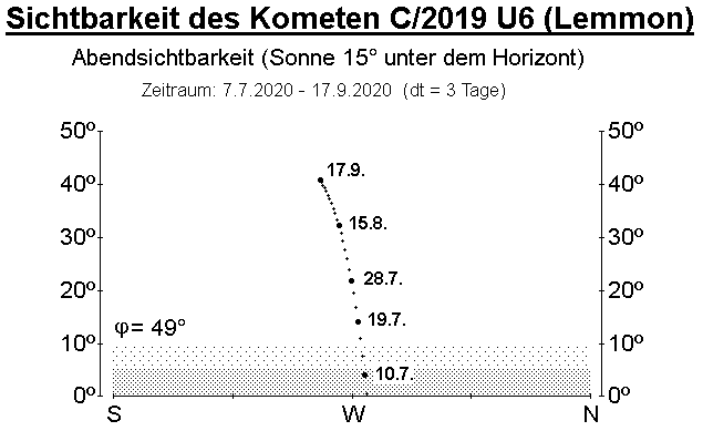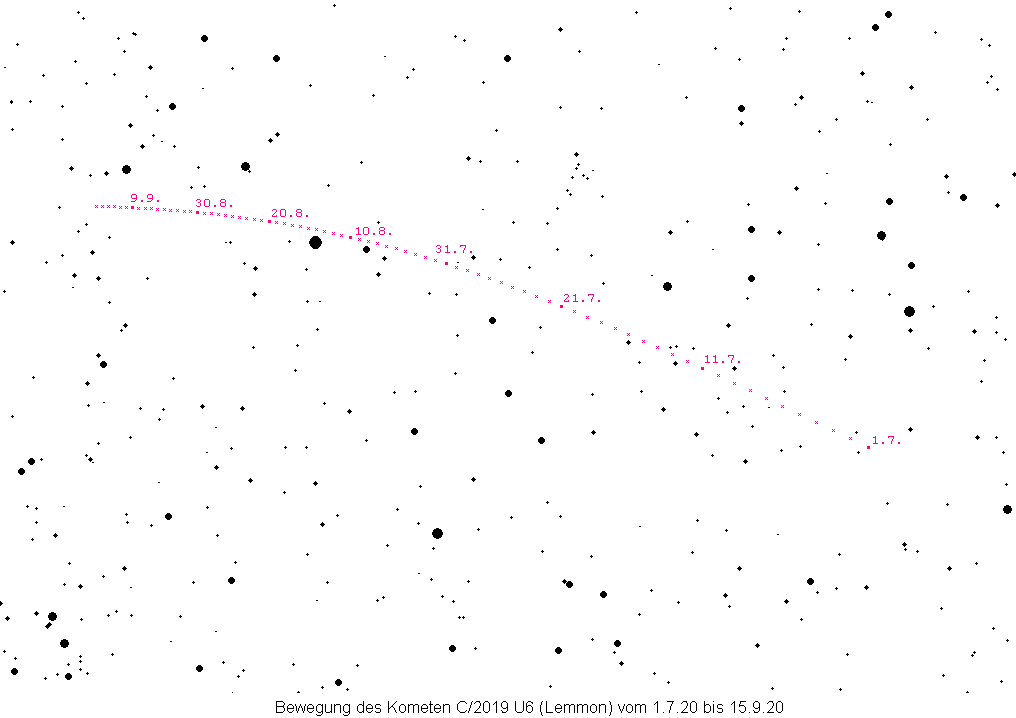 Ab dem 10. Juli 2020 kann der Komet C/2019 U6 (Lemmon) am Abendhimmel beobachtet werden. Sofern er seine Entwicklung der ersten Monate beibehält, kann er im Fernglas aufgefunden werden (Details in der AVKa-Schnellmitteilung Nr. 102.
