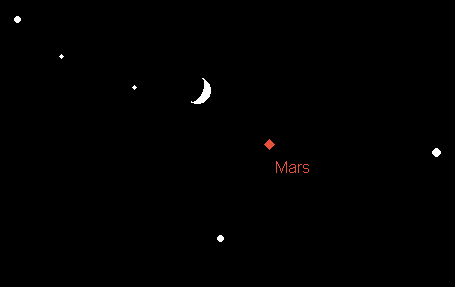 wandert durch das Sternbild Stier und tritt am 24. April ins Sternbild Zwillinge. Seine Helligkeit sinkt leicht von 1.3m auf 1.5m ab, seine Untergänge verfrühen sich von 1:45 MESZ auf 1:15 MESZ. Am 12. April passiert Mars den Stern Alnath (beta Tau) in 4° südlichem Abstand. Am 17. April findet man die Mondsichel 3° links oberhalb des Roten Planeten. Der Durchmesser des Marsscheibchens geht auf 4.6“ zurück – zu wenig, um im Teleskop Oberflächendetails erkennen zu können.