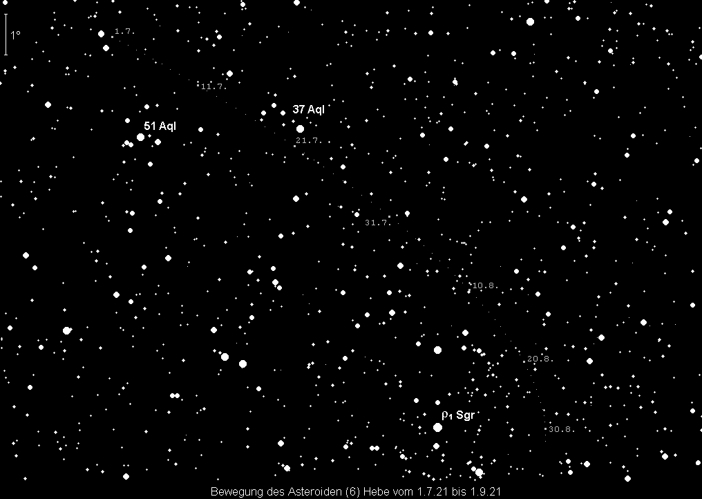 Kleinplanet Nr. 6 hat seine Opposition gerade hinter sich. Sie läuft durch den nördlichen Teil des Sternbilds Schütze. Ihre Helligkeit sinkt im Monatsverlauf von 8.5m auf 9.1m ab. Die beste Beobachtungszeit verlagert sich von 0:00 MESZ auf 22:00 MESZ.