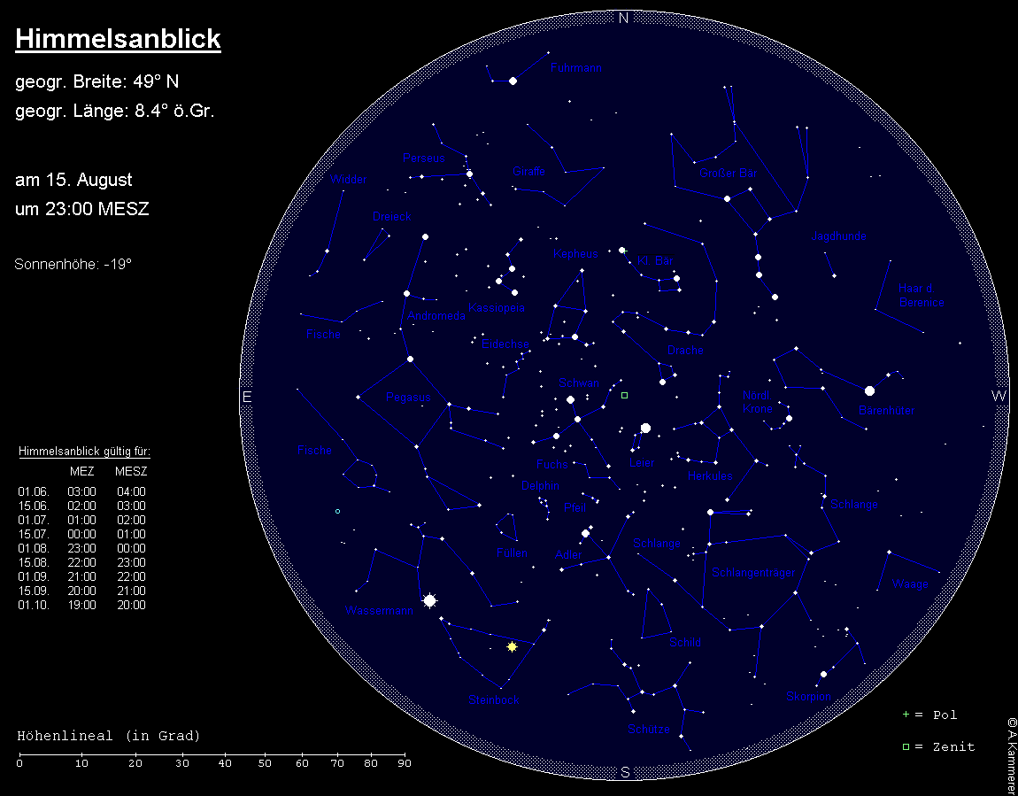 Im August ist zu den Standard-Beobachtungszeiten (24:00 MESZ zu Monatsbeginn, 23:00 MESZ zur Monatsmitte und 22:00 MESZ am Monatsende) die astronomische Dämmerung bereits beendet und somit der Sternenhimmel in seiner ganzen Pracht beobachtbar.