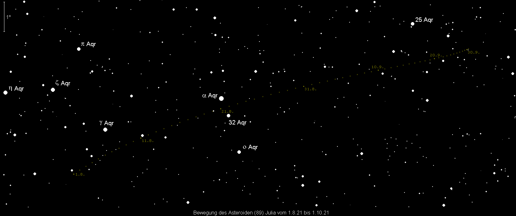 Kleinplanet Nr. 89 erreicht am 24. August eine sehr günstige Opposition im nördlichen Teil des Sternbilds Wassermann. Ihre Helligkeit steigt im Verlauf des August von 9.4m auf den Maximalwert von 8.9m, so dass sie in einem guten Fernglas erkennbar ist. Die beste Beobachtungszeit verlagert sich von 3:00 MESZ auf 0:30 MESZ.