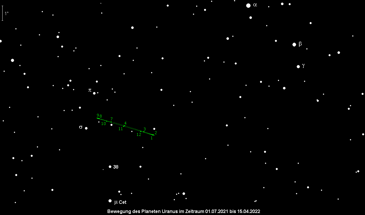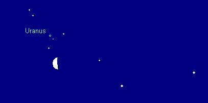 ist ein Fernglasobjekt der zweiten Nachthälfte. Der 5.8m helle Planet wird am 20. August stationär und läuft anschließend rückläufig durch das Sternbild Widder – leider weitab markanter Sterne. Uranus geht zu Monatsbeginn gegen 0:15 MESZ auf, am Monatsende bereits gegen 22:15 MESZ. Beobachtbar wird er aber erst eine Stunde danach. Der Mond passiert den grünlichen Planeten am 1. August (2.5° unterhalb) und am 28. August (5° rechts unterhalb).