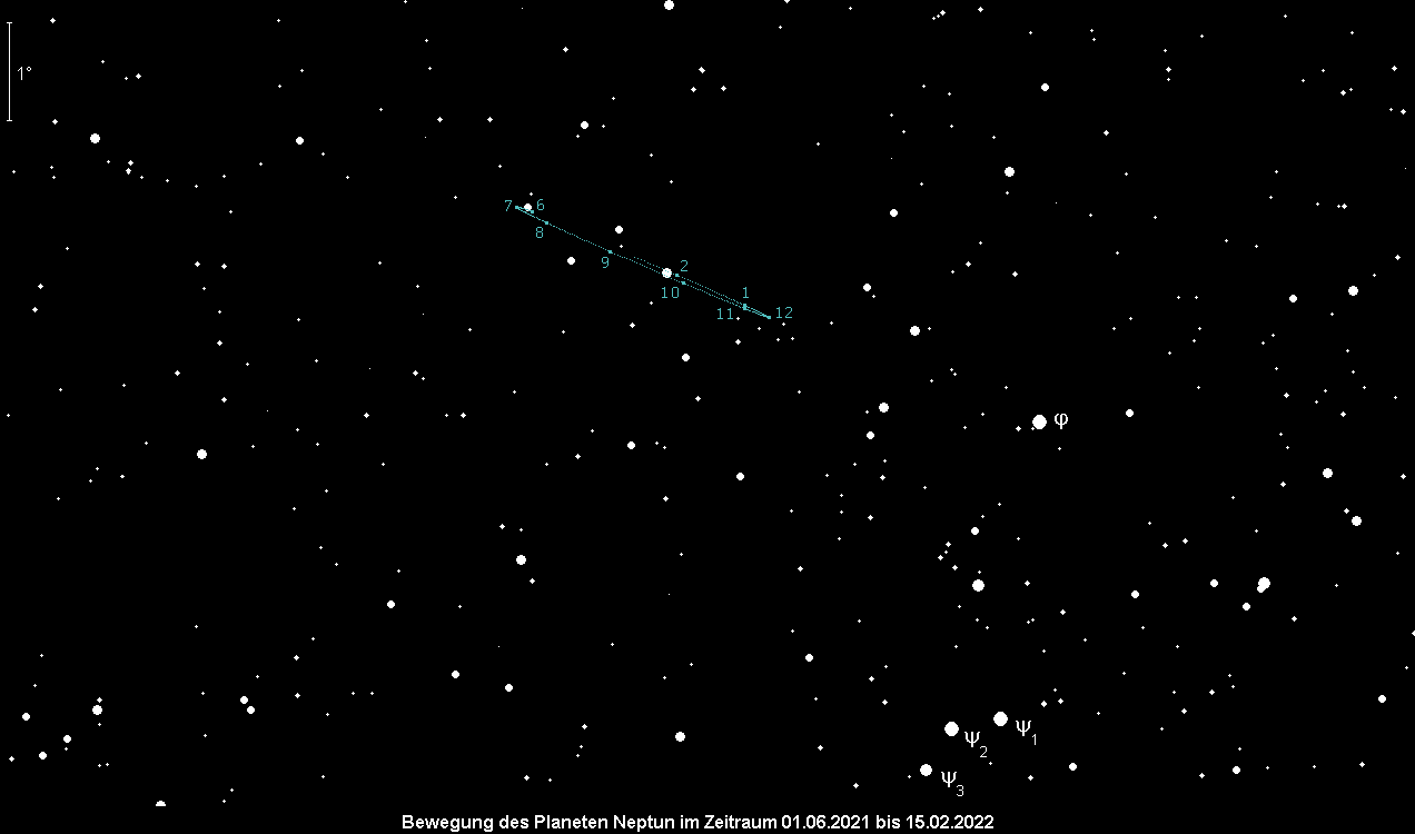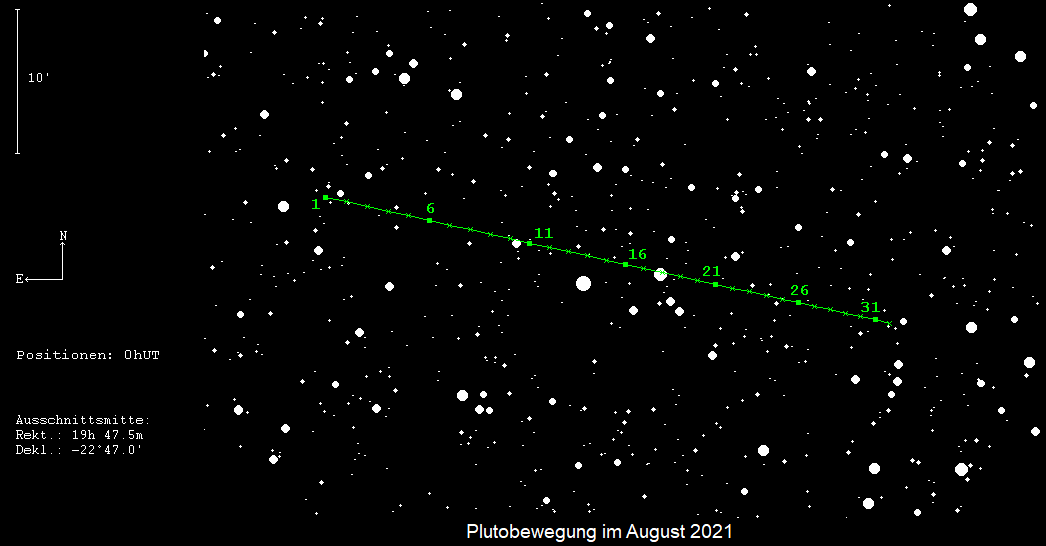 ist ein Fernglasobjekt der zweiten Nachthälfte, welches ab der Monatsmitte bereits vor Mitternacht beobachtet werden kann. Der 7.8m helle Planet bewegt sich rückläufig durch das Sternbild Wassermann, leider weitab markanter Sterne. Zu Monatsbeginn kann man kurz nach Mitternacht am östlichen Himmel nach Neptun suchen, am Monatsende bereits ab etwa 22:30 MESZ. Die Kulmination verlagert sich von 3:15 MESZ auf 1:15 MESZ. Der nahezu volle Mond passiert Neptun am Morgen des 24. August und dürfte eine Fernglasbeobachtung in jenen Tagen verhindern.