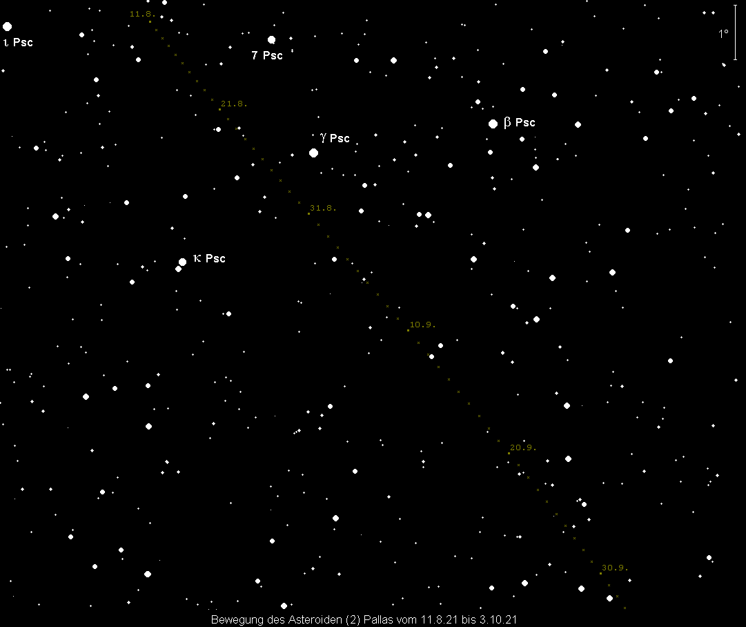 Kleinplanet Nr. 2 kann in der zweiten Nachthälfte beobachtet werden. Sie bewegt sich rückläufig durch den Kopf des Sternbilds Fische. Ihre Helligkeit steigt im Monatsverlauf von 9.4m auf 8.7m. Die beste Beobachtungszeit verlagert sich von 4:00 MESZ auf 2:00 MESZ.