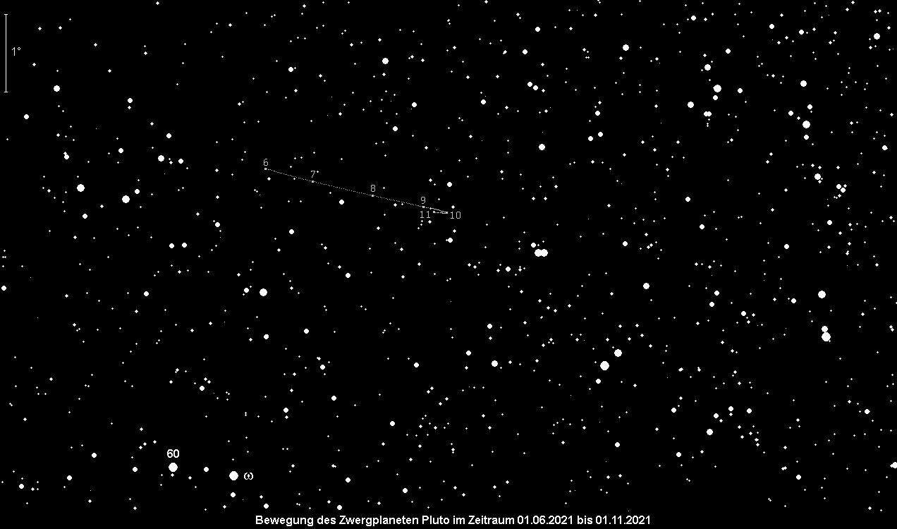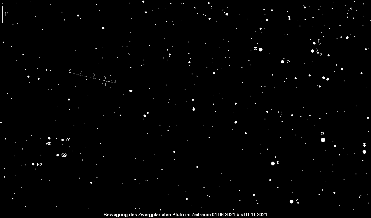 steht am 20. August in Opposition zur Sonne und ist nach dem Mond das bei weitem auffälligste Objekt am Nachthimmel. Der –2.9m helle Planet bewegt sich rückläufig und tritt am 19. August wieder in das Sternbild Steinbock. Er geht in der Abenddämmerung auf und in der Morgendämmerung unter, kann somit die ganze Nacht über beobachtet werden. Am Morgen des 22. August findet man den Vollmond knapp 6° unterhalb des Gasplaneten. Jupiter zeigt ein Planetenscheibchen von 49.1“ (Äquator) bzw. 45.9“ (Pol) Durchmesser. Nun lohnt es sich, die sich ständig verändernden Wolkenstrukturen zu beobachten, insbesondere den Großen Roten Fleck. Gleichermaßen lohnend ist es, die ständig wechselnden Positionen der hellen Monde Io, Europa, Ganymed und Callisto zu verfolgen, die von Jupiter bedeckt und verfinstert werden können, und die umgekehrt, als Scheibchen mit ihren Schatten vor der Jupiterscheibe, erkannt werden können. Spezialisten können versuchen, die vier großen Monde als winzige Scheibchen zu erkennen (scheinbare Durchmesser 1.1“ bis 1.8“). Als besonderer Leckerbissen kommt es dieses Jahr zu gegenseitigen Bedeckungen und Verfinsterungen zwischen den Monden, die mit Instrumenten ab 20cm Öffnung verfolgt werden können. Am 2. August findet eine streifende Bedeckung von Europa durch Ganymed zwischen 0:00:49 und 2:05:35 MESZ statt. Am 8. August dringt Ganymeds Schatten zwischen 22:13:42 und 23:18:44 MESZ bis zu 37% des Europa-Scheibchens vor. Wenige Stunden später, am 9. August zwischen 5:37:08 und 6:44:41 MESZ, verfinstert Ganymed Europa erneut, dieses Mal dringt der Ganymed-Schatten bis zu 66% des Europa-Durchmessers vor. Schließlich verfinstert am 30. August Ganymed Europa zwischen 21:02:52 und 21:15:28 MESZ bis zu 23%. Dies ist bereits die letzte von Karlsruhe aus sichtbare gegenseitige Bedeckung/Verfinsterung während der aktuellen Bahnebenenpassage. Die geringe Horizonthöhe und teilweise vorhandene Dämmerung stellt allerdings eine Herausforderung dar.