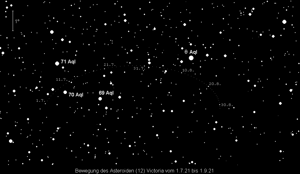 Kleinplanet Nr. 12 stand am 30. Juli in einer sehr günstigen Opposition im östlichen Grenzbereich des Sternbilds Adler. Ihre Helligkeit geht im Monatsverlauf von 8.7m auf 9.3m zurück. Die beste Beobachtungszeit verlagert sich von 1:00 MESZ auf 23:00 MESZ.