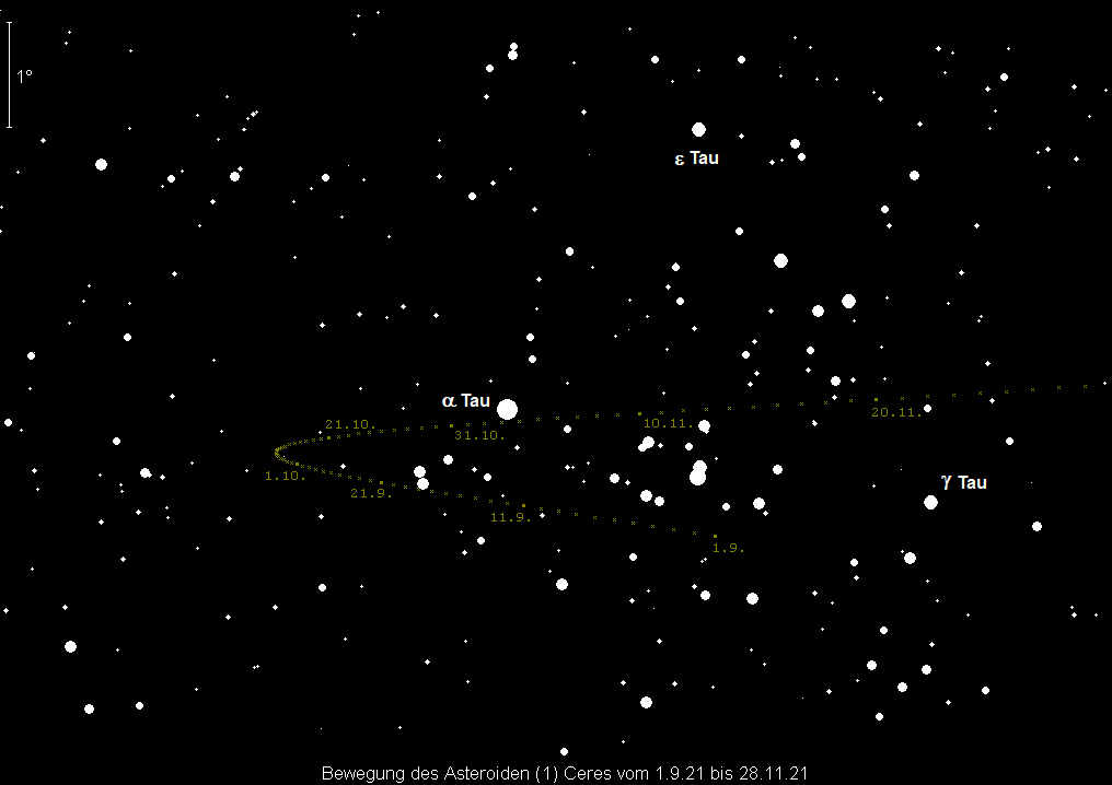 ist zwar noch recht schwach und nur in der zweiten Nachthälfte zu beobachten, doch bewegt sie sich im September im südlichen Bereich der Hyaden und passiert Aldebaran am 11. September in 0.9° südlichem Abstand, so dass sie bereits jetzt erwähnt werden soll. Der Kleinplanet Nr. 1 ist zu Monatsbeginn 8.8m und am Monatsende 8.3m hell. Die beste Beobachtungszeit verlagert sich von 5:00 MESZ auf 5:45 MESZ.
