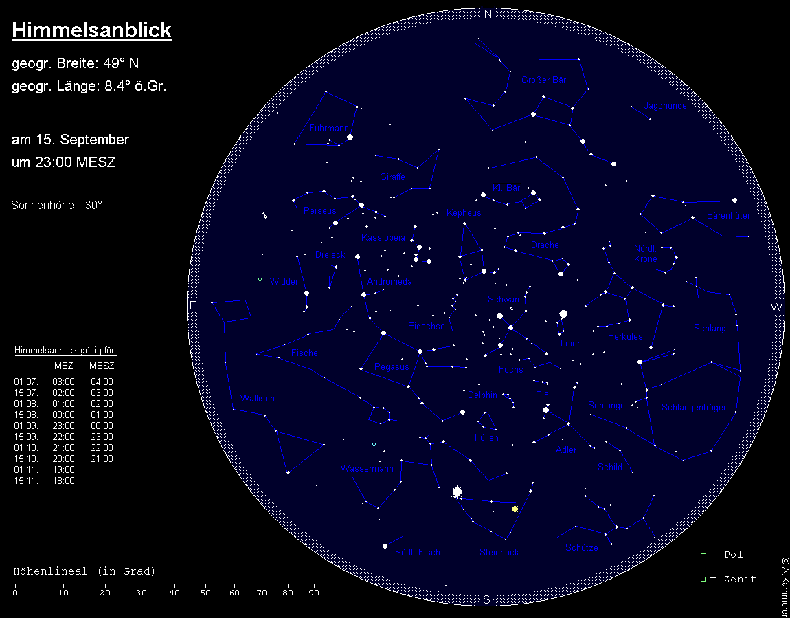 Das Sommerdreieck, gebildet aus den hellen Sternen Wega in der Leier, Deneb im Schwan (fast im Zenit) und Atair im Adler, ist an den Südwesthimmel gerückt, zieht aber weiterhin die Blicke auf sich. In diesem Himmelsbereich finden sich auch die kleinen Sternbilder Schild, Pfeil, Füchschen, Delphin und Füllen. Dabei ist das Sternbild Delphin, welches eben den Meridian passiert, das markanteste dieser fünf kleinen Konstellationen.