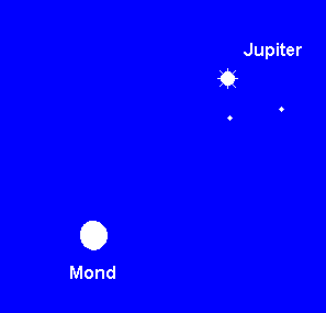 stand Ende August in Opposition zur Sonne und bewegt sich rückläufig durch das Sternbild Steinbock (nahe der Grenze zum Sternbild Wassermann). Seine monatliche Bewegung kann man anhand von delta Cap als Referenz deutlich erkennen. Jupiter ist nach dem Mond das bei weitem auffälligste Objekt am Nachthimmel, wenn auch seine Helligkeit leicht von –2.9m auf –2.7m zurückgeht. Den Mond findet man am Morgen des 18. September 7° unterhalb des Riesenplaneten, am frühen Abend des 19. September 7° links unterhalb desselben. Jupiter zieht sich langsam vom Morgenhimmel zurück. Sein Untergang verlagert sich im Verlauf des Monats von 5:15 MESZ auf 3:15 MESZ. Im Teleskop können weiterhin die sich ständig verändernden Wolkenstrukturen und das Wechselspiel der vier hellen Jupitermonde beobachtet werden. Besonders interessant ist dieses Jahr, dass das gewöhnlich auffällige Südliche Äquatorialband (SEB) kaum erkennbar ist. Der Durchmesser des deutlich elliptischen Riesenplaneten verkleinert sich von 48.9x45.7“ auf 46.3x43.3“.