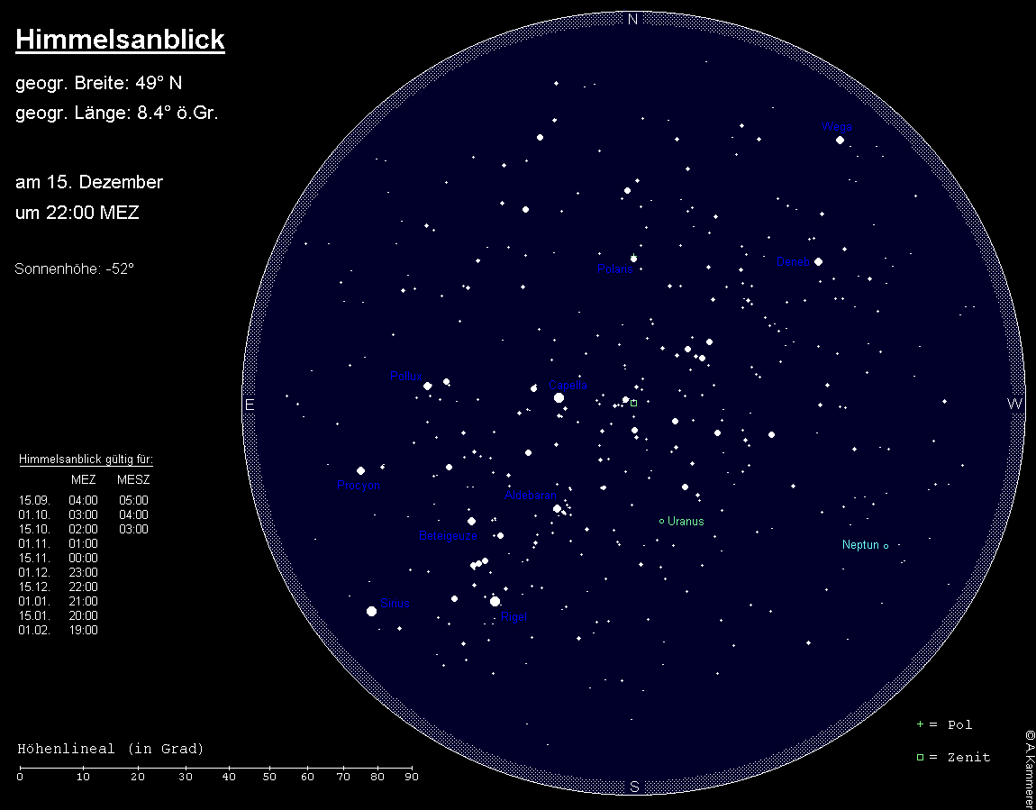 ist ein im Fernglas leidlich gut sichtbares Objekt. Der 7.8m helle Planet wird am 1. Dezember stationär und bewegt sich anschließend wieder rechtläufig durch das Sternbild Wassermann, leider weitab markanter Sterne. In den Tagen um den 11. Dezember wird allerdings der Mond eine Beobachtung stark behindern. Im Teleskop zeigt Neptun ein 2.4“ großes Scheibchen, das ab etwa 200x sicher erkennbar wird. Spezialisten können versuchen, den größten Mond Triton (13.4m hell) etwa 15“ neben Neptun zu erkennen. Neptuns Kulmination verlagert sich von 19:00 MEZ auf 17:00 MEZ, seine Untergänge von 0:45 MEZ auf 22:45 MEZ, wobei Neptun zwei Stunden zuvor im Horizontdunst unsichtbar wird.