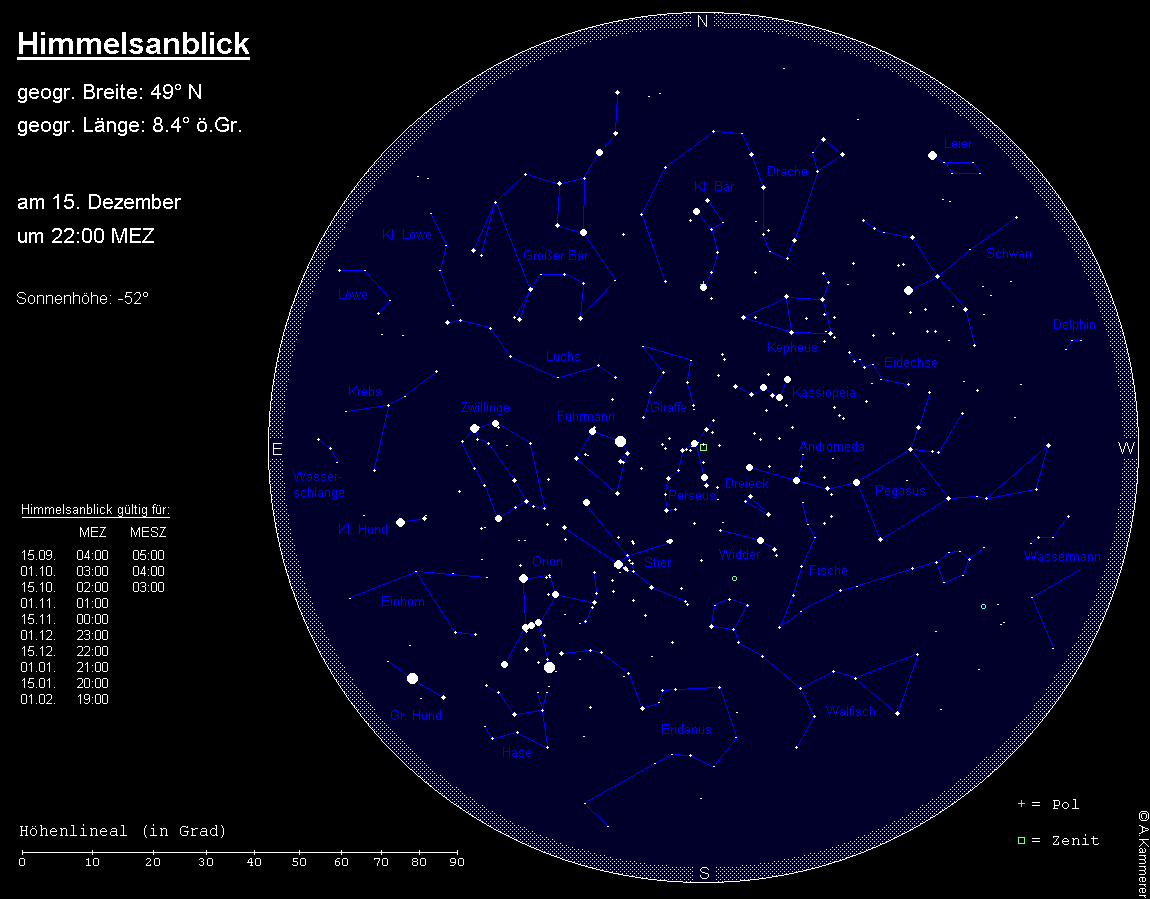 Im Südwesten geht das Sternbild Wassermann unter. Ein Großteil des Südwesthimmels nimmt das Sternbild Walfisch ein, welches nicht einfach auszumachen ist. Im Süden kulminiert das noch schwieriger zu identifizierende ausgedehnte Sternbild Eridanus, das sich von Rigel im Orion in einem weiten Bogen zunächst nach Westen und dann nach Süden zieht und dessen hellster Stern Achernar von uns aus gesehen nie über den Horizont steigt. Über unseren Köpfen – genau im Zenit – steht das Sternbild Perseus und östlich davon das Sternbild Fuhrmann mit der hellen Capella. Südlich dieser beiden Sternbilder erstreckt sich der Stier mit dem orangefarbenen Aldebaran und den zwei Sternhaufen Hyaden (um Aldebaran) und Plejaden (rechts oberhalb von Aldebaran).