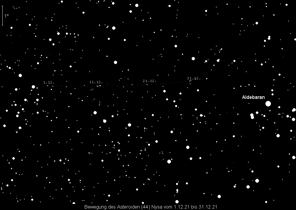 Spezialisten können sich im Dezember an dem Kleinplaneten Nr. 44 versuchen. Nysa bewegt sich rückläufig durch das Sternbild Stier auf Aldebaran zu, den sie aber nicht erreichen wird. Ihre Opposition erreicht der Kleinplanet am 12. Dezember mit einer Helligkeit von 9.1m. Zu Monatsanfang und am Monatsende beträgt ihre Helligkeit 9.3m. Die beste Beobachtungszeit verlagert sich von 1:00 MEZ auf 22:30 MEZ, doch kann sie fast die ganze Nacht über aufgesucht werden.