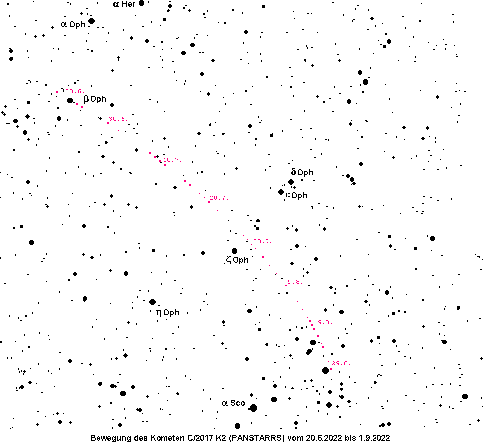 In den nächsten Wochen kann der Komet C/2017 K2 (PANSTARRS) mit kleineren Instrumenten am Abendhimmel beobachtet werden. Aktuell 9.0m wird in den kommenden Wochen nur ein geringer Helligkeitsanstieg erwartet. Details finden sich im AVKa-Beobachterinfo Nr. 11.