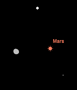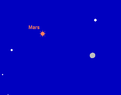 wird zum interessantesten Objekt am Nachthimmel. Er bewegt sich rückläufig durch das Sternbild Stier und steigert seine Helligkeit von –1.2m auf –1.9m. Die Aufgänge verfrühen sich im Monatsverlauf von 19:15 MEZ auf 16:45 MEZ. Der Vollmond steht am Morgen und am Abend des 11. November in der Nähe. Am Morgen 5.5° rechts unterhalb und am Abend 3.5° links des Roten Planeten. Im Teleskop präsentiert sich Mars nun sehr detailreich. Das nahezu voll beleuchtete Marsscheibchen wächst von 15.0“ auf den diesjährigen Maximalwert von 17.2“ an, da die größte Erdnähe bereits am 1. Dezember erreicht wird. Da in dieser Opposition weder die Nord- noch die Südhalbkugel signifikant zu uns geneigt sind, sind die Polkappen eher schwierig zu beobachten. Hingegen zeigen sich viele Albedostrukturen, deren Kontrast (mit Ausnahme der Großen Syrte) aber relativ gering ist, so dass man das Scheibchen schon eine gewisse Zeit betrachten muss, um diese zu bemerken. Mit größeren Instrumenten kann nach den beiden winzigen Monden Phobos (11.5m) und Deimos (12.5m) gesucht werden, die sich aber nie mehr als 25“ bzw. 40“ vom sehr hellen Planeten entfernen und deren Beobachtung daher extrem schwierig ist.