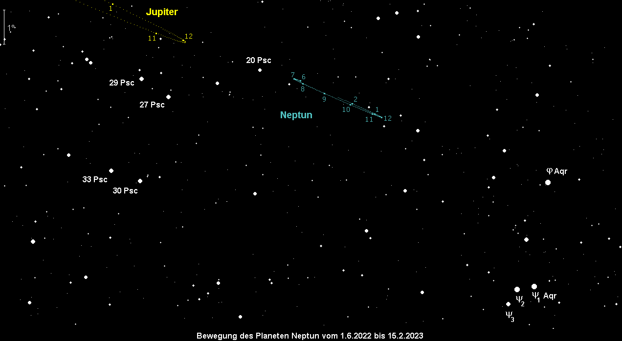 bewegt sich rechtläufig durch das Sternbild Wassermann, nahe der Grenze zum Sternbild Fische. Der 7.9m helle Planet ist selbst aus der Stadt heraus im Fernglas leidlich gut erkennbar, sofern man ihn nahe der Kulmination beobachtet. Diese erfolgt zu Monatsbeginn gegen 21:15 MEZ, am Monatsende gegen 19:15 MEZ. Am 4. November passiert der helle Mond Neptun und dürfte sinnvolle Beobachtungen behindern. Im Teleskop weist Neptun ein grünblaues Scheibchen mit einem Durchmesser von 2.4“ auf. Mit mittelgroßen Instrumenten kann auch sein größter Mond Triton (13.5m hell) gesichtet werden, der sich nie mehr als 16“ von Neptun entfernt.