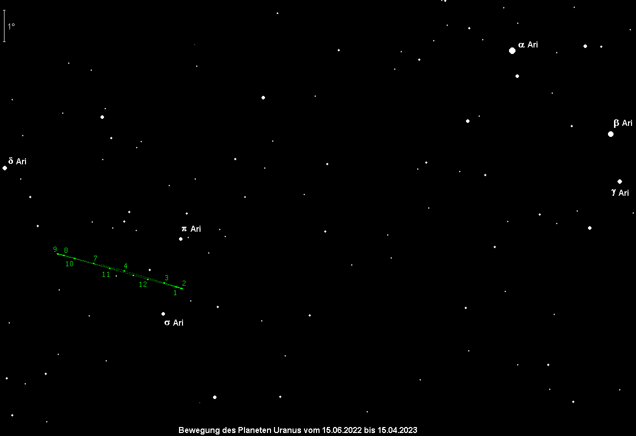steht am 9. November in Opposition zur Sonne. Damit geht er bei Sonnenuntergang auf, kulminiert gegen 0:30 MEZ im Süden und geht bei Sonnenaufgang unter. Der 5.6m helle Planet bewegt sich rückläufig durch den südöstlichen Teil des Sternbilds Widder, leider weitab markanter Sterne. Dennoch kann man versuchen, den sechsten Großplaneten unter dunklem Himmel auch mit dem bloßen Auge zu entdecken, wobei die relative Sternarmut sogar von Vorteil ist. Am frühen Abend des 8. November steht der Vollmond 2.5° links unterhalb von Uranus. Im Teleskop zeigt sich das grünliche, 3.8“ große Uranusscheibchen ab etwa 100-facher Vergrößerung deutlich. Besitzer mittelgroßer Instrumente können sich auch an den größten Uranusmonden Titania (13.8m) und Oberon (14.1m) versuchen, die sich nie weiter als etwa 30“ bzw. 40“ vom Uranusscheibchen entfernen.
