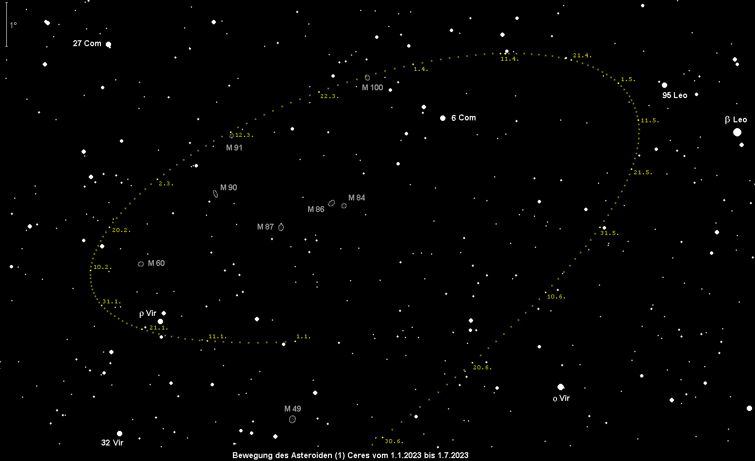 kann am Morgenhimmel aufgesucht werden. Der Zwergplanet und zudem Kleinplanet Nr. 1 bewegt sich rechtläufig durch die nördlichen Bereiche des Sternbilds Jungfrau. Seine Helligkeit steigt von 8.2m auf 7.8m an. Die Meridianpassage erfolgt zu Monatsbeginn gegen 6:00 MEZ, am Monatsende um 4:30 MEZ.