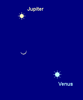ist der dominierende Planet des frühen Abendhimmels. Sie gewinnt zunehmend an Horizonthöhe. Der –3.9m helle Planet wandert in der ersten Monatshälfte durch das Sternbild Wassermann und in der zweiten durch das Sternbild Fische. Damit nähert sich der Abendstern Jupiter immer mehr an. Am 15. Februar passiert Venus gegen Mittag den fernen Neptun in weniger als 1‘ Abstand. Bis zum Abend ist die Distanz bereits wieder auf 16‘ angewachsen. Neptun kann aufgrund seiner geringen Horizonthöhe und der extremen Helligkeit der Venus allerdings ausschließlich im Teleskop ausgemacht werden. Die Untergänge verlagern sich von 19:15 MEZ auf 20:45 MEZ. Am Abend des 22. Februar steht die schmale Mondsichel zwischen Venus und Jupiter, 4° links oberhalb ersterer. Dieses Dreigestirn wird einen spektakulären Anblick bieten. Am Monatsende trennen Venus und Jupiter nur noch 1.5°. Im Teleskop wächst das Venusscheibchen nur geringfügig von 11“ auf 12“ an, der Beleuchtungsgrad geht von 92% auf 86% zurück.