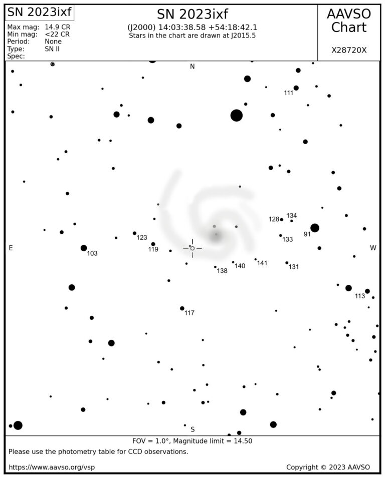 In der Spiralgalaxie M 101 im Sternbild Großer Bär ist eine helle Supernova aufgetaucht. Aufgrund der enormen Distanz zu dieser Galaxie ist sie dennoch nur 11hell. Eine solch "helle" Supernova taucht allerdings nur alle 5-10 Jahre auf. AVKa-Schnellmitteilung Nr. 110.