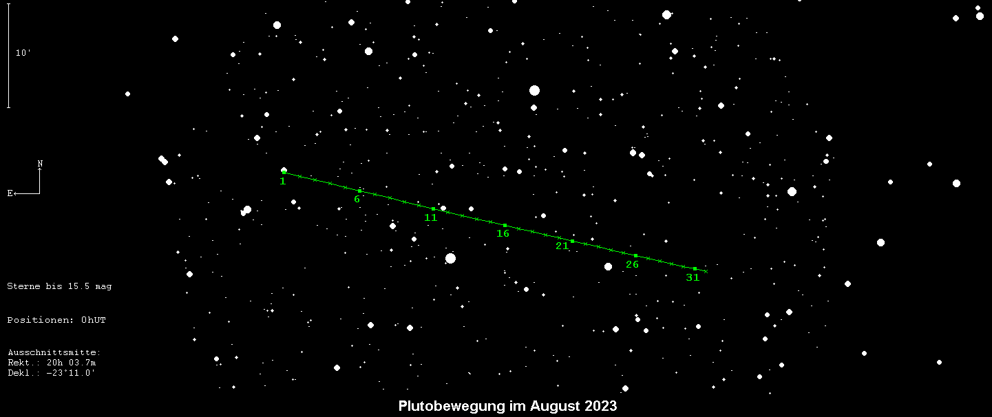 stand Ende Juli in Opposition zur Sonne und kann im August zu günstiger Zeit beobachtet werden. Der 14.4m helle Zwergplanet bewegt sich rückläufig nahe der Grenze der Sternbilder Steinbock und Schütze. Seine sehr südliche Position erschwert Beobachtungen allerdings deutlich. Dennoch kann man versuchen, ihn mit Instrumenten ab 30 cm Öffnung zu finden. Am aussichtsreichsten ist eine Beobachtung nahe der Kulmination, die zu Monatsbeginn um 1:00 MESZ, am Monatsende um 23:00 MESZ stattfindet. Die drei Aufsuchkarten sollen eine Hilfe bei der Identifikation sein. Die dritte Aufsuchkarte zeigt Sterne bis 15.5m.