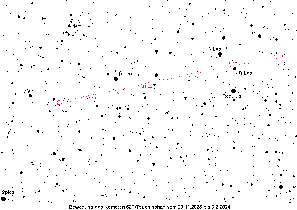 Der Komet 62P/Tsuchinshan wird sein Perihel am 1. Weihnachtsfeiertag passieren und sollte dann 8-9m hell sein. Er bewegt sich im Dezember und Januar durch die Sternbilder Löwe und Jungfrau und kann damit gut am Morgenhimmel beobachtet werden. Details entnehme man dem AVKa-Beobachterinfo Nr. 13.