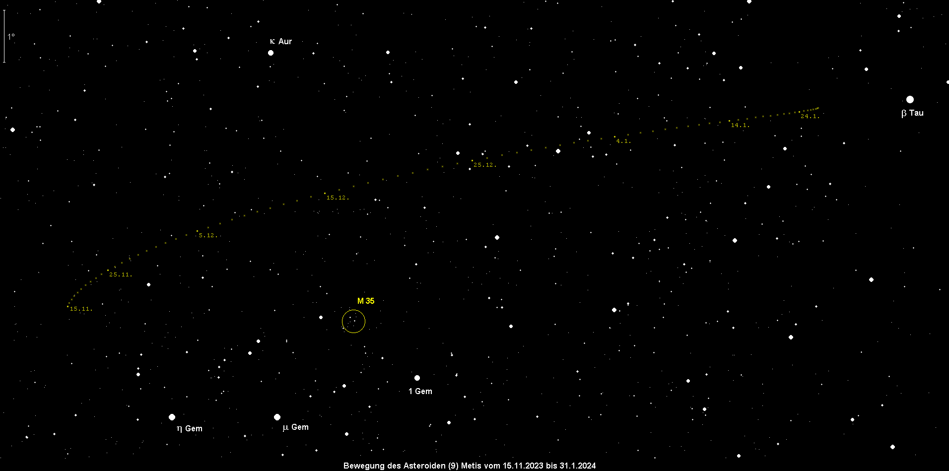 bewegt sich rückläufig im nordöstlichsten Teil des Sternbilds Stier, etwa 7° nördlich von Vesta. Kleinplanet Nr. 9 wird im Monatsverlauf zum schwierigen Fernglasobjekt. Ihre Helligkeit geht von 8.6m auf 9.5m zurück. Somit sollte man sie in der Zeit um die Kulmination aufsuchen, die zu den gleichen Zeiten wie bei Vesta stattfindet.