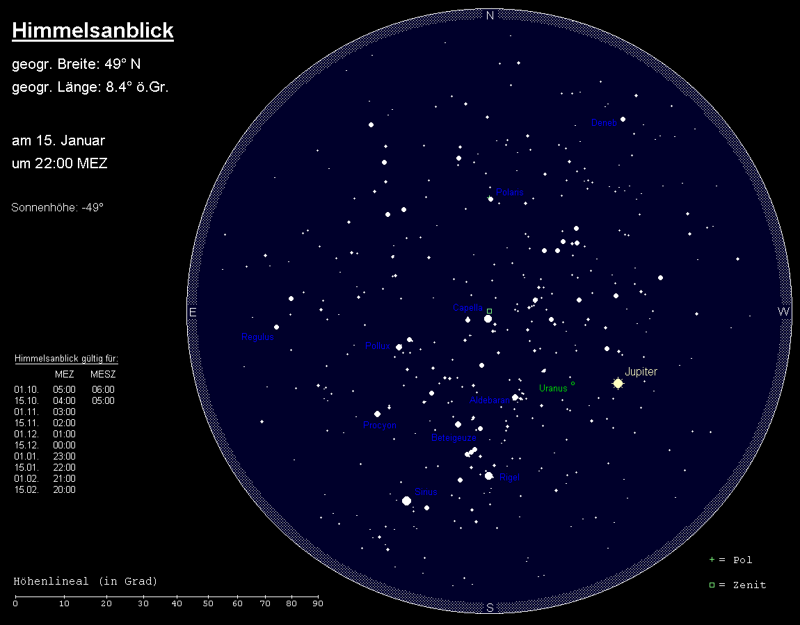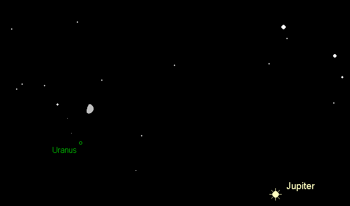 wird am 27. Januar stationär und bewegt sich anschließend wieder rechtläufig durch das Sternbild Widder, wobei er etwa 13° östlich Jupiters steht. Der 5.7m helle Planet verlagert seine Untergänge von 4:00 MEZ auf 2:00 MEZ, doch  wird er etwa eine Stunde zuvor unsichtbar. Die Meridianpassage (beste Beobachtungszeit) verschiebt sich von 20:45 MEZ auf 18:45 MEZ. Den Mond findet man am Abend des 19. Januars 2° oberhalb des grünlichen Planeten. Im Teleskop zeigt sich das 3.7“ große Uranusscheibchen ab etwa 100-facher Vergrößerung deutlich. Besitzer mittelgroßer Instrumente können sich auch an den größten Uranusmonden Titania (13.8m) und Oberon (14.1m) versuchen, die sich nie weiter als etwa 30“ bzw. 40“ vom Planetenscheibchen entfernen.