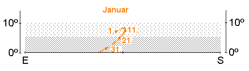 kann ab dem Neujahrstag am Morgenhimmel beobachtet werden, nicht allzu weit von der strahlenden Venus entfernt. Gegen 7:30 MEZ findet man den 0.5m hellen Planeten tief über dem Südosthorizont. Am 2. Januar wird er stationär und läuft anschließend rechtläufig zunächst durch das Sternbild Schlangenträger, ab dem 12. Januar durch das Sternbild Schütze. Am 7. Januar erreicht der dann –0.2m helle Planet seine größte Horizonthöhe, die bei dieser Sichtbarkeit aber bescheiden ausfällt. Die schmale Mondsichel kann am Morgen des 9. Januar bei der Identifikation behilflich sein; sie steht allerdings immerhin 9° rechts unterhalb von Merkur. Am 12. Januar steht der flinke Planet in größter westlicher Elongation mit 24°. In der Folge nehmen die Horizonthöhen kontinuierlich ab. Letztmals dürfte man den noch immer –0.2m hellen Planeten um den 22. Januar sichten können, wobei die beste Beobachtungszeit noch immer gegen 7:30 MEZ eintritt.
