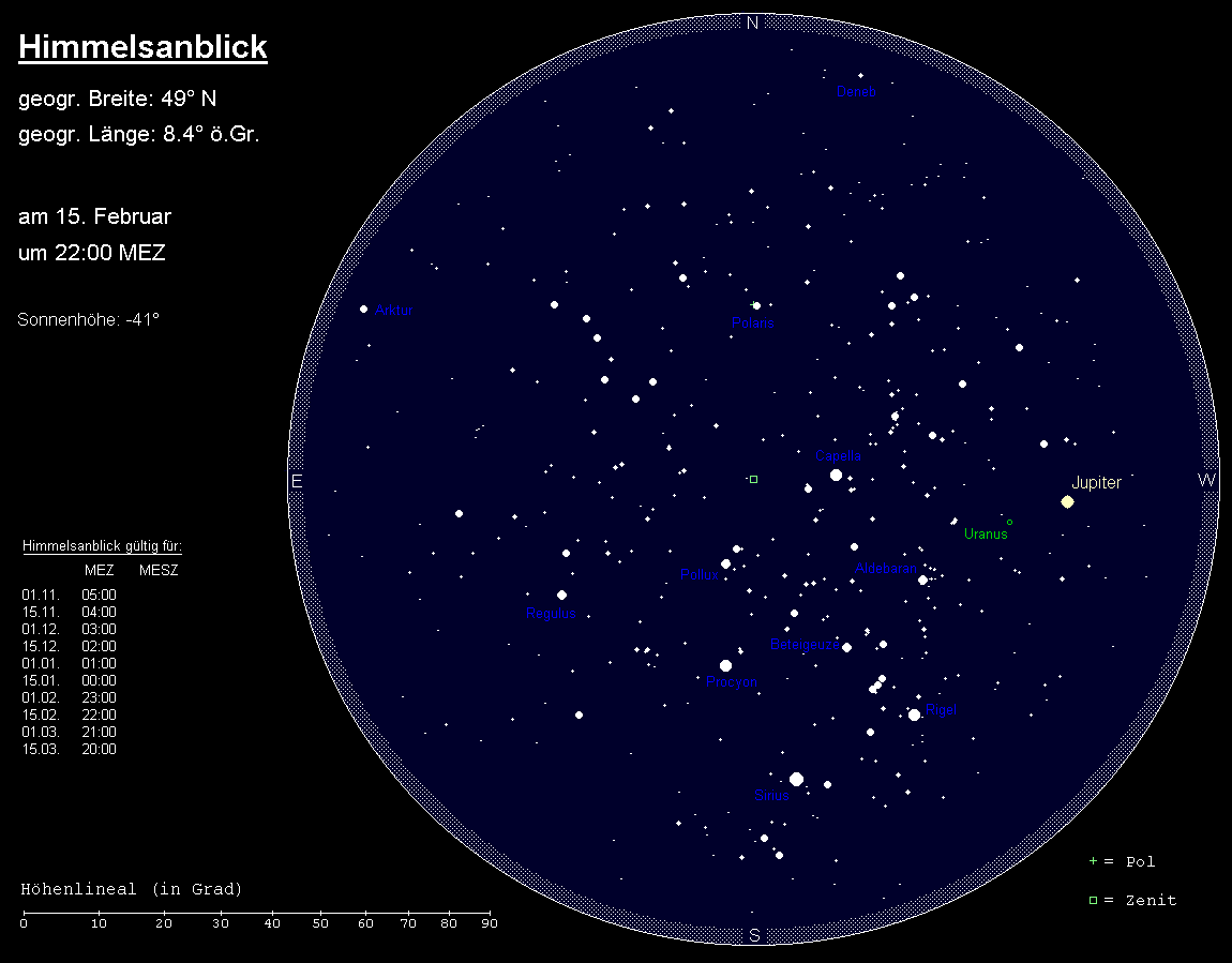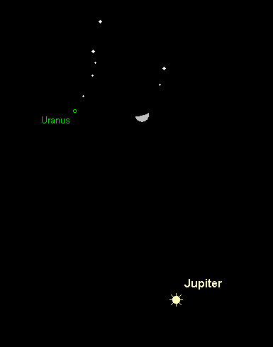 ist ein einfaches Fernglasobjekt der ersten Nachthälfte. Er bewegt sich rückläufig durch das Sternbild Widder, etwa 9° östlich von Jupiter. Der 5.8m helle grünliche Planet geht zu Monatsbeginn um 2:00 MEZ, am Monatsende um 0:15 MEZ unter. Etwa eine Stunde zuvor verschwindet er im Horizontdunst. Am Abend des 15. Februar nähert sich der Mond mehr und mehr Uranus. Kurz vor dem Untergang finden wir ihn 3° rechts des Planeten. Im Teleskop können weiter das Planetenscheibchen und in größeren Teleskopen die beiden hellsten Monde Titania (13.9m) und Oberon (14.2m) ausgemacht werden.