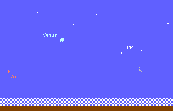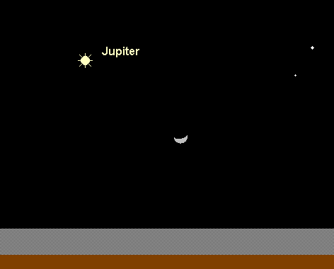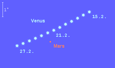 sinkt dem südöstlichen Morgenhorizont Woche um Woche stetig näher. Am Monatsende wird der –3.9m helle Morgenstern zu einem schwierigen Objekt in der helleren Morgendämmerung. Den gesamten Monat über erfolgt ihr Aufgang gegen 6:30 MEZ. Am 7. Februar findet man die schmale Mondsichel fast 10° rechts unterhalb der Venus – eine kleine Herausforderung. Am 22. Februar passiert Venus den schwachen Mars im Abstand von lediglich 0.6°. Ob diese horizontnahe Konjunktion in der hellen Dämmerung im Fernglas sichtbar ist, ist sehr unsicher. Eventuell gelingt die Sichtung in einem Teleskop. Im Teleskop zeigt die Venus eine fast volle Phasengestalt (der Beleuchtungsgrad nimmt von 86% auf 91% zu); der scheinbare Durchmesser geht von 12.2“ auf 11.1“ zurück.