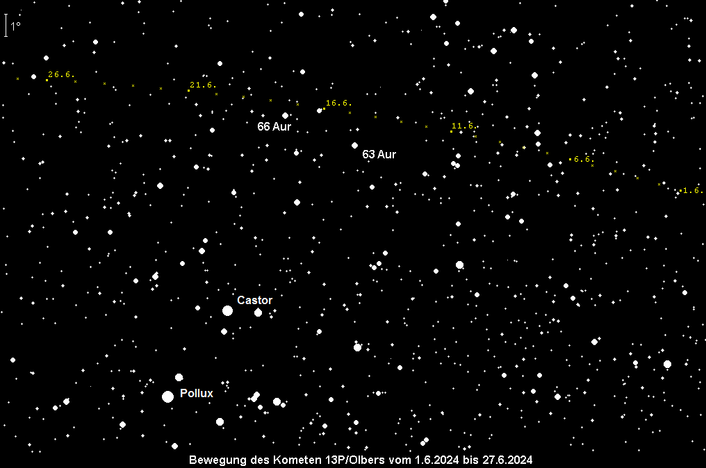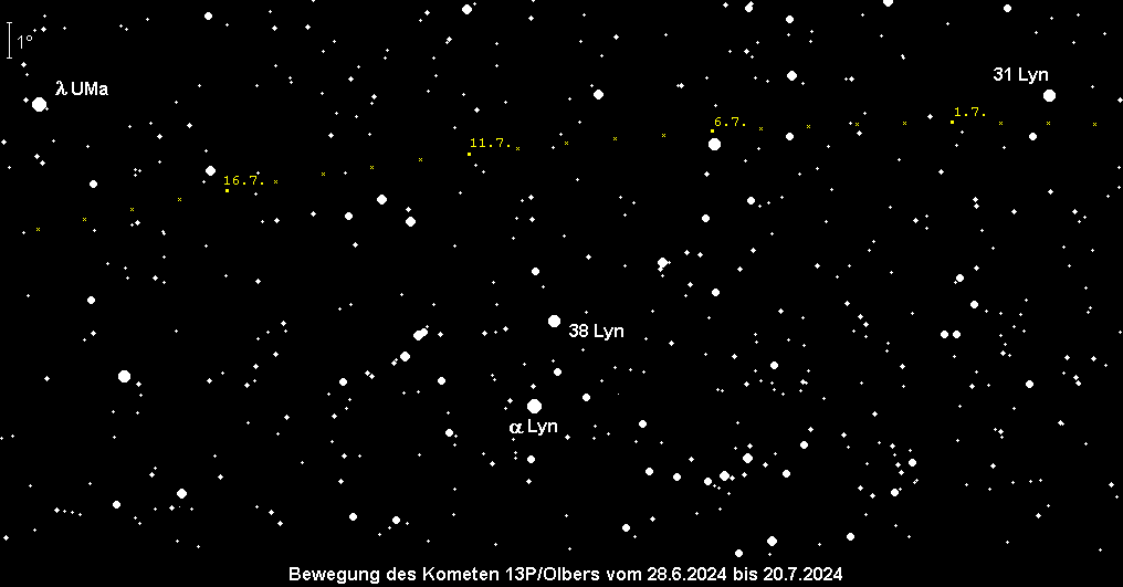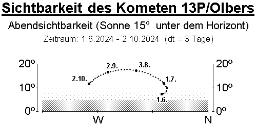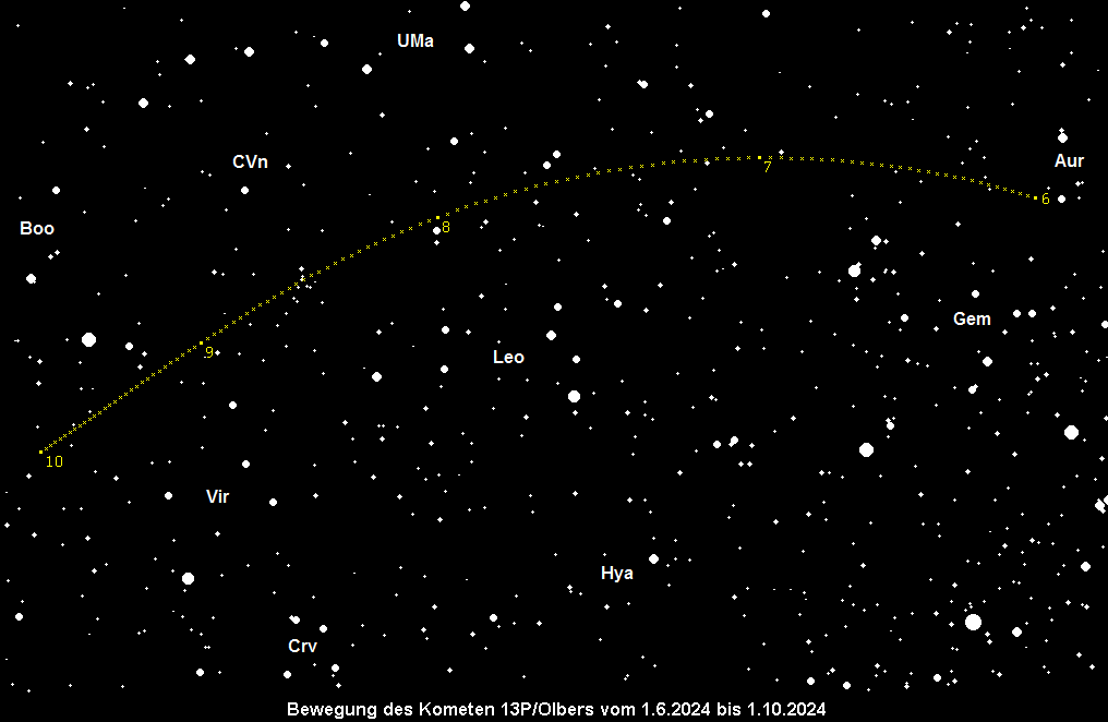 Der Komet 13P/Pons-Brooks läuft auf einer halley-ähnlichen Bahn und passiert sein Perihel am 30. Juni. Nach dem Kometen 12P/Pons-Brooks ist es der zweite Komet der Halley-Kometenfamilie, der innerhalb einer kurzen Zeitspanne seine Sonnennähe erreicht. Leider steht der Komet 13P/Olbers recht tief über dem Abendhorizont und ist somit trotz einer Maximalhelligkeit von 6m in den kommenden Wochen ein schwieriges Fernglasobjekt. Details entnehme man dem AVKa-Beobachterinfo Nr. 14.