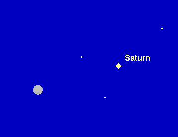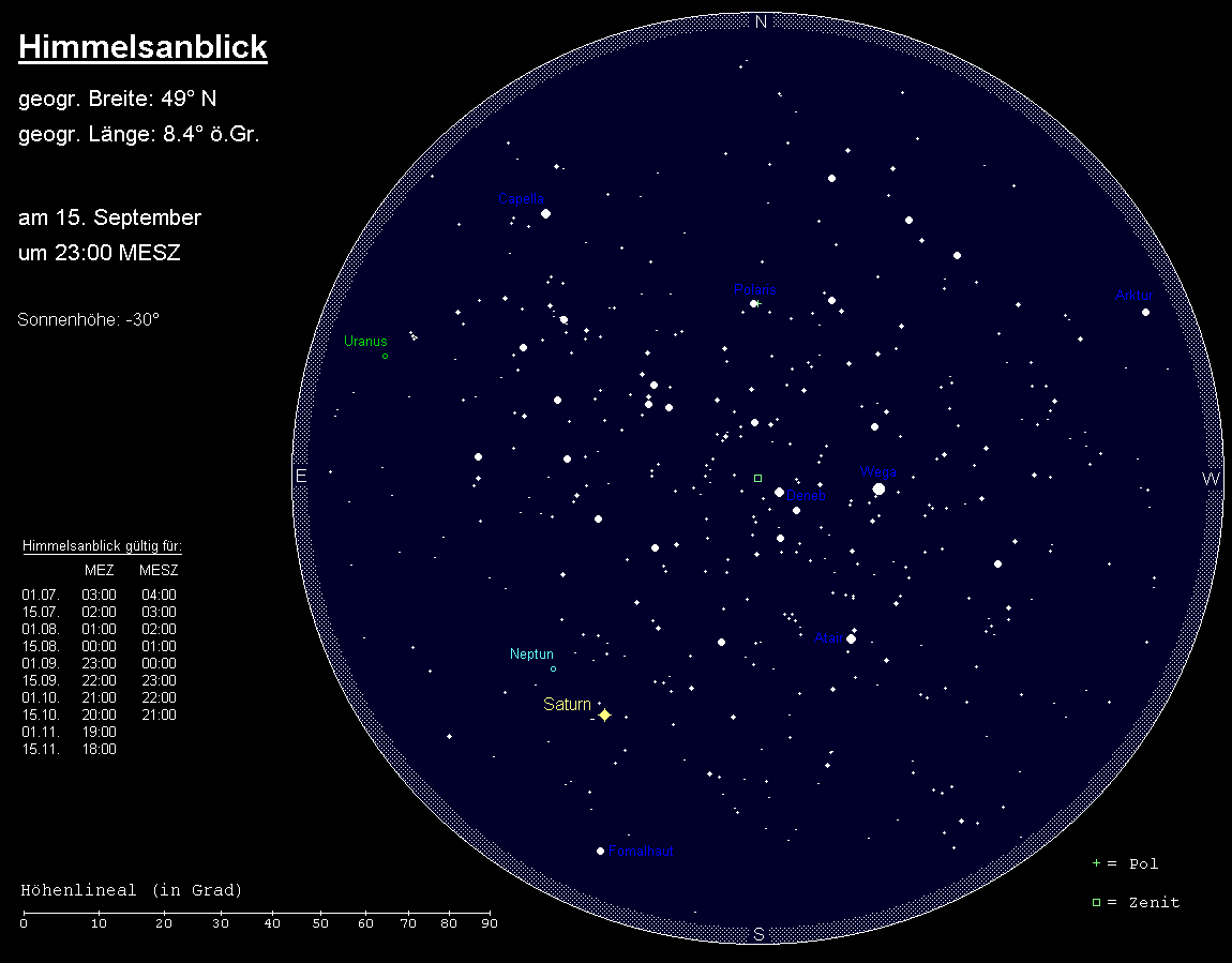 steht am 8. September in Opposition zur Sonne. Damit geht er bei Sonnenuntergang im Osten auf und zum Sonnenaufgang im Westen unter. Der rückläufig durch das Sternbild Wassermann wandernde Planet erreicht eine maximale Helligkeit von 0.6m. Der Vollmond passiert den Ringplaneten am Mittag des 17. Septembers. Am Morgen findet man ihn 5° rechts unterhalb, am Abend 5° links unterhalb von Saturn. Im Teleskop präsentiert der Planet ein ovales Scheibchen mit einem Äquatordurchmesser von 19.2“ und einem Poldurchmesser von 17.1“. Der Ring ist nur knapp 4° gegen die Blickrichtung zum Beobachter geneigt und weist eine Längenausdehnung von 43.6“ und einen Querdurchmesser von 2.9“ auf. Damit können aktuell weder die Cassinische Teilung noch andere Details im Ring erkannt werden. Mit kleineren Instrumenten können vier der fünf helleren Monde beobachtet werden, nämlich Tethys (10.2m), Dione (10.4m), Rhea (9.7m) und Titan (8.3m). Japetus befindet sich im September östlich des Ringplaneten und weist damit der Erde seine dunkle Seite zu. Mit größeren Instrumenten kann man versuchen, zusätzlich die deutlich schwierigeren Monde Enceladus (11.7m) und Hyperion (14.2m) auszumachen. Während ersterer Saturn noch innerhalb der Tethys-Bahn umläuft und somit immer nahe des Rings steht, läuft letzterer auf einer Bahn, die sich etwas außerhalb der Titan-Bahn befindet.