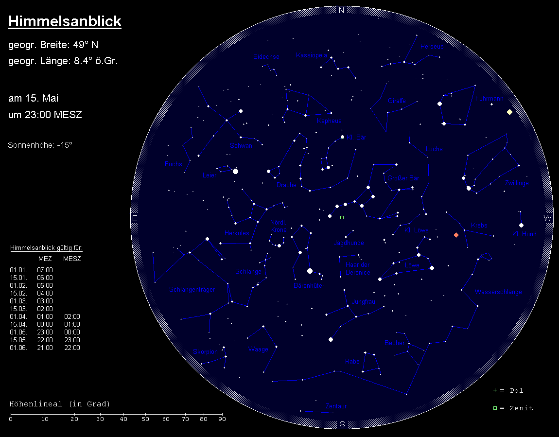Zur Standardbeobachtungszeit (24:00 MESZ am Monatsanfang, 23:00 MESZ zur Monatsmitte und 22:00 MESZ am Monatsende) steht der Große Wagen über unseren Köpfen im Zenit. Er ist der auffälligste Teil des größeren Sternbilds Großer Bär. Unterhalb der Wagendeichsel leuchtet das nur aus zwei Sternen bestehende Sternbild Jagdhunde. In der fünffachen Verlängerung der vorderen Wagensterne stoßen wir auf den Polarstern, der stets genau im Norden steht. Er ist der hellste Stern des Sternbilds Kleiner Bär, das außer dem Polarstern noch zwei hellere Sterne aufweist, die nun fast ihre höchste Stellung erreicht haben. Der Gegenpart des Großen Bären, das Sternbild Kassiopeia oder Himmels-W, steht nun tief über dem Nordhorizont.