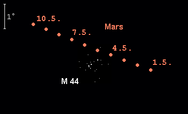 wird am Abendhimmel zunehmend unscheinbarer. Seine Helligkeit sinkt während des Monats von 0.9m auf 1.3m ab, womit er am Monatsende etwa so hell wie Regulus ist, auf den er zusteuert. Am 25. Mai tritt Mars vom Sternbild Krebs ins Sternbild Löwe über. Die Untergänge des Roten Planeten verlagern sich im Monatsverlauf von 3:00 MESZ auf 1:45 MESZ. In der Nacht des 3./4. Mai steht der Mond nach Mitternacht 1° oberhalb des Roten Planeten. Am 4. und 5. Mai passiert Mars den Sternhaufen der Praesepe in nur 0.6° nördlicher Distanz, d.h. er steht in den äußeren Bereichen dieses Sternhaufens. Teleskopisch ist Mars nicht mehr interessant. Der Durchmesser des Marsscheibchens schrumpft von 6.6“ auf 5.5“, wobei noch immer eine deutliche Phase erkennbar ist.