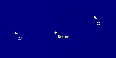 taucht in der ersten Maiwoche wieder am Morgenhimmel auf. Allerdings bleibt der Ringplanet während des gesamten Monats ein Objekt der Dämmerung. In den ersten Monatstagen kann man Venus zu Hilfe nehmen, die sich nach ihrer gemeinsamen Konjunktion am 29. April zunehmend von Saturn entfernt. Der 1.2m helle Saturn bewegt sich rechtläufig durch den westlichen Teil des Sternbilds Fische. Seine Aufgänge verlagern sich im Verlauf des Mai von 4:45 MESZ auf 3:00 MESZ. Am Morgen des 22. Mai findet man die breite Mondsichel 8° rechts von Saturn, am 23. Mai 7° links von diesem. Für teleskopische Beobachtungen steht der Ringplanet noch zu tief. Am 6. Mai wechselt die Sonne von der Nord- auf die Südseite der Ringe.