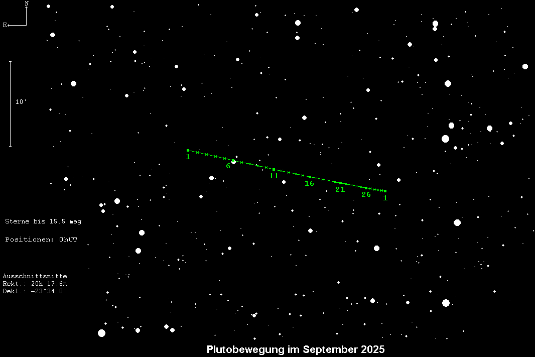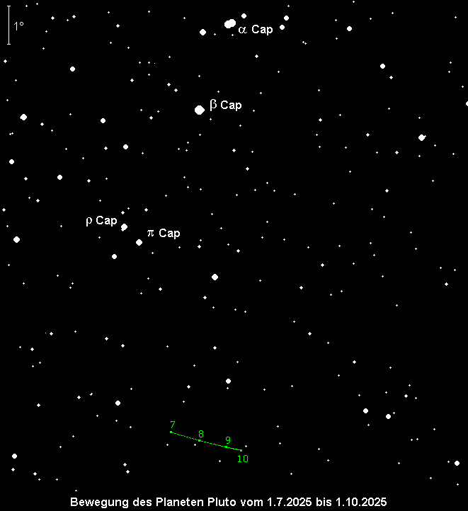 kann am früheren Abend noch beobachtet werden. Allerdings ist es selbst mit einem 30cm-Teleskop schwierig, den nur 14.4m hellen Zwergplaneten im Sternbild Steinbock zu erkennen. Am besten versucht man, ihn in den zwei Stunden um die Kulmination zu finden. Diese findet zu Monatsbeginn um 23:15 MESZ, am Monatsende bereits um 21:15 MESZ statt. Die drei Aufsuchkarten sollen bei der Identifikation behilflich sein.