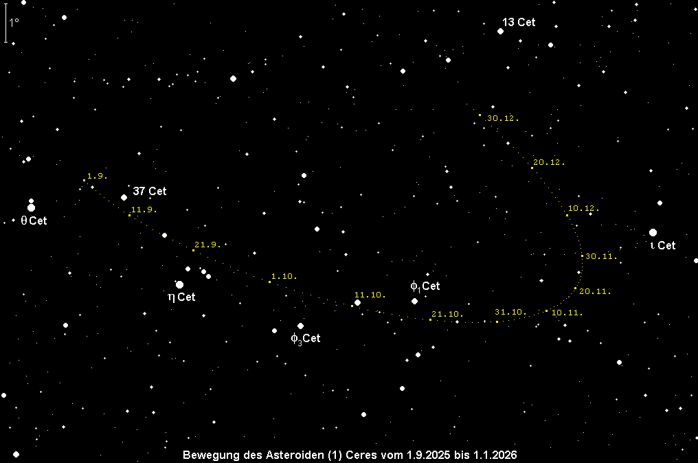 kann noch bis zum Monatsende beobachtet werden, wird aber zum schwierigen Objekt im Fernglas. Sie bewegt sich rechtläufig durch das Sternbild Walfisch, wobei ihre Helligkeit von 8.7m auf 9.1m zurückgeht. Aufgrund der nur mäßigen Horizonthöhen sollte Kleinplanet Nr. 1, der gleichzeitig ein Zwergplanet ist, in den vier Stunden um die Kulmination beobachtet werden. Diese ereignet sich zu Monatsbeginn gegen 20:15 MEZ, am Monatsende gegen 18:30 MEZ.