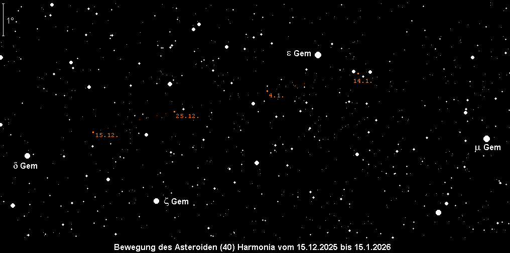 kommt Anfang Januar 2026 in eine sehr günstige Opposition. Ihre Helligkeit erreicht am 20. Dezember 9.5m, womit sie in einem Fernglas beobachtet werden kann. Kleinplanet Nr. 40 wandert rückläufig durch das Sternbild Zwillinge, kann somit während des Großteils einer Nacht in großen Horizonthöhen aufgefunden werden. Ihre Kulmination erfolgt am 15. Dezember um 2:00 MEZ, zum Monatsende um 0:45 MEZ.