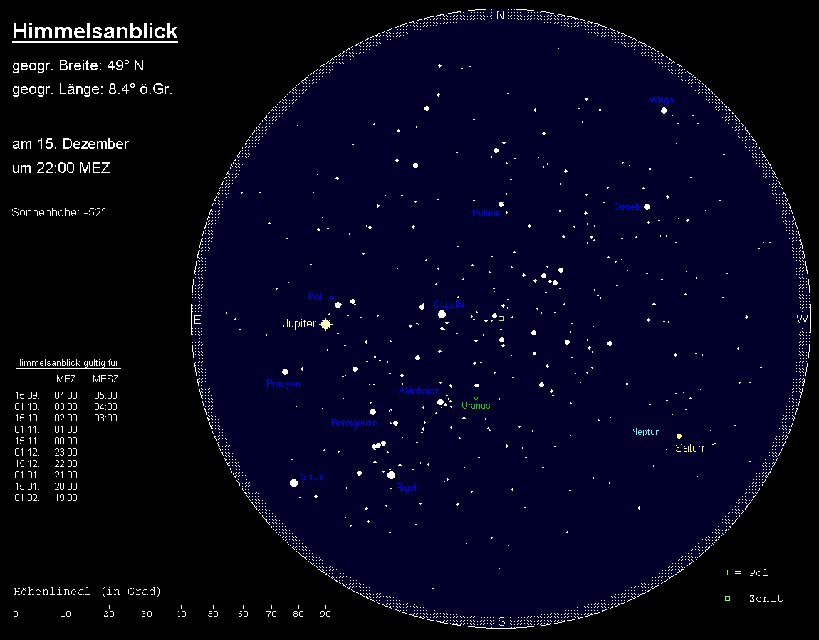 dominiert die ganze Nacht als strahlendes Objekt. Seine Opposition ist nicht mehr fern. Rückläufig im Sternbild Zwillinge erreicht er große Horizonthöhen. Seine Helligkeit steigt von –2.5m auf –2.7m an. Der Aufgang erfolgt am 1. Dezember um 19:30 MEZ, am 31. Dezember bereits um 17:15 MEZ. Den noch sehr runden Mond findet man am 7. Dezember, gleich nach Aufgang beider Gestirne, 3.5° links des Gasplaneten. Im Teleskop bietet Jupiter einen prächtigen Anblick. Der Äquatordurchmesser des elliptischen Planetenscheibchens wächst im Monatsverlauf von 44.2“ auf 46.5“ an. Damit können selbst in kleineren Instrumenten vielfältige atmosphärische Strukturen ausgemacht werden. Hierzu zählen neben dem auffälligen nördlichen und südlichen Äquatorband und dem Großen Roten Fleck einige weitere Bänder. Diese liegen näher an den Polen und sind deutlich unauffälliger, weshalb für deren Sichtung größere Instrumente erforderlich sind. Des Weiteren ist das täglich wechselnde Spiel der vier hellsten Monde reizvoll zu verfolgen, genauso wie die Erscheinungen der Monde (Bedeckungen bzw. Verfinsterungen durch Jupiter und Vorübergänge bzw. Schattenwürfe vor der Jupiterscheibe). Mit größeren Instrumenten und hohen Vergrößerungen können die vier hellsten Monde sogar als winzige Scheibchen erkannt werden, mit Durchmessern von 1.1“ bis 1.8“. Spezialisten können sich zudem am Mond Himalia versuchen. Dieser ist nur 14.9m hell, befindet sich aber im Dezember immerhin 50‘ westlich des hellen Planeten.