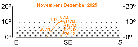 wird von der Sonne zum Jahresende beinahe eingeholt und steht daher unbeobachtbar mit dieser am Taghimmel.
