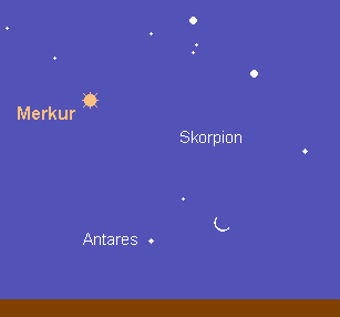 kann bis kurz nach Weihnachten am Morgenhimmel aufgefunden werden. Er bewegt sich durch die Sternbilder Waage, Skorpion und Schlangenträger, so dass er über dem Südosthorizont erscheint. Am 1. Dezember sollte man den 0.0m hellen Planeten gegen 7:00 MEZ beobachten. Am 7. Dezember erreicht der dann –0.5m helle Merkur seine größte westliche Elongation mit knapp 21° und gleichzeitig die größte Horizonthöhe. In den folgenden Tagen findet man Merkur in stetig geringerer Höhe. Am 16. Dezember steht Merkur nahe des 2.4m hellen Sterns beta Sco, der aber nur in einem Fernglas erkennbar ist. Beobachtet werden sollte gegen 7:30 MEZ. Am 18. Dezember kann man bei sehr günstigen Bedingungen die schmale Mondsichel 7° rechts unterhalb von Merkur finden. Spezialisten können den –0.5m hellen Planeten eventuell noch bis zum 27. Dezember ausmachen. Allerdings erreicht der Planet an diesem Morgen erst gegen 8:00 MEZ die für eine erfolgreiche Beobachtung erforderliche Horizonthöhe.